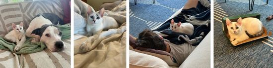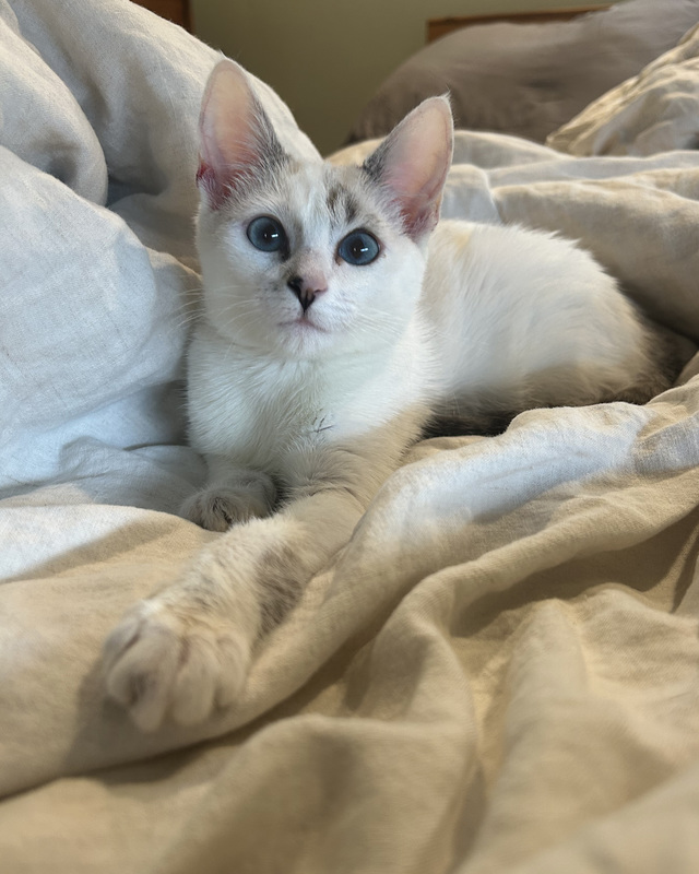 Now, you couldn’t tell from looking at her that her paws were once so swollen she didn’t walk. Her beautiful fur has grown back, and her eyes are bright and playful again. Clementine has spent three months in the attentive foster care of our own medical manager, Jesse. Once she began to feel better, Clementine became a happy, fun, confident kitten who loves to play, sunbathe, and meet new people. She loves grooming, snuggling, and playing with Jesse’s 60-pound dog, and so we think she would appreciate a home with a cat or dog friend to keep her company. If you’d like to see video footage of Clementine’s kitten antics, check out the reel we have posted about her on Facebook or Instagram.